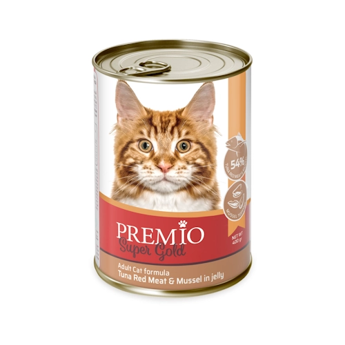 פרמיו סופר גולד שימור בשר טונה אדומה בציפוי צדפות בג’לי, הינו מזון משלים לחתולים בוגרים, החל מגיל 12 חודשים.