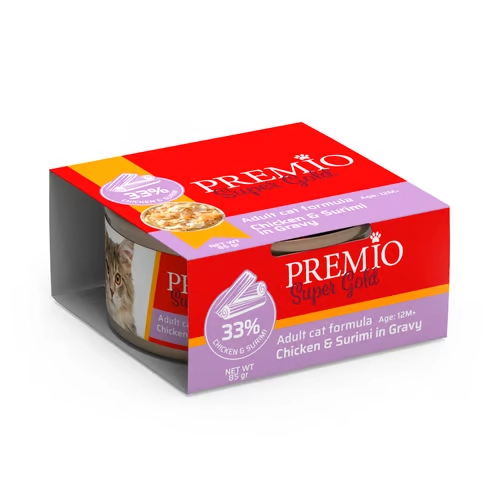 שימורי פרמיו סופר גולד עוף וסורימי ברוטב – 85 גרם של טעם מהים עם חלבון איכותי