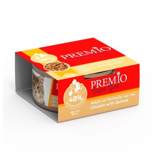שימורי פרמיו סופר גולד עוף וקינואה ברוטב 85 גרם, לחתולים בוגרים.