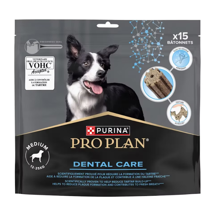 חטיף דנטלי Purina Pro Plan לכלבים מגזע בינוני פותח במיוחד לניקוי שיניים יעיל ולהפחתת הצטברות פלאק ואבנית. החטיף משלב מרקם וצורה ייחודיים יחד עם טעימות גבוהה, והופך את שגרת טיפוח הפה של הכלב לפשוטה ומהנה.