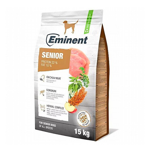 Eminent Senior 15kg הוא מזון יבש ייעודי לכלבים מבוגרים מגיל 7 ומעלה, שפותח במיוחד כדי לתמוך בצרכים התזונתיים של כלבים בגיל מתקדם.