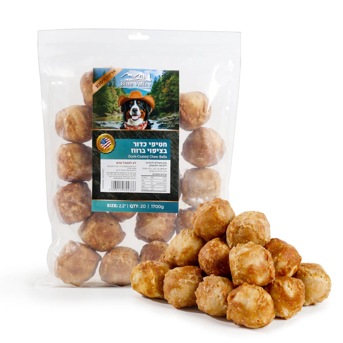 בלו וואלי (Blue Valley) – חטיפי כדור בציפוי ברווז (1.7 ק”ג) כ-20 כדורים במארז.