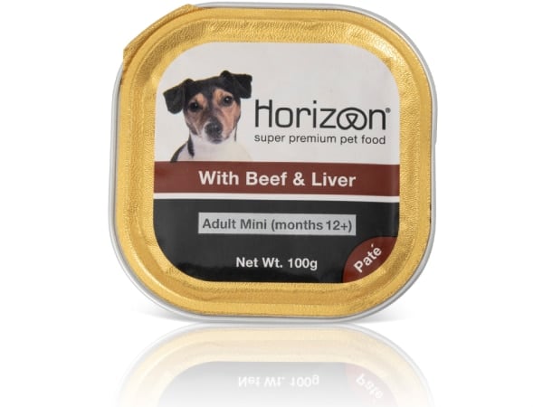 מעדן שימור הורייזן לכלב בוגר מגזע קטן במרקם פטה על בסיס בקר וכבד.